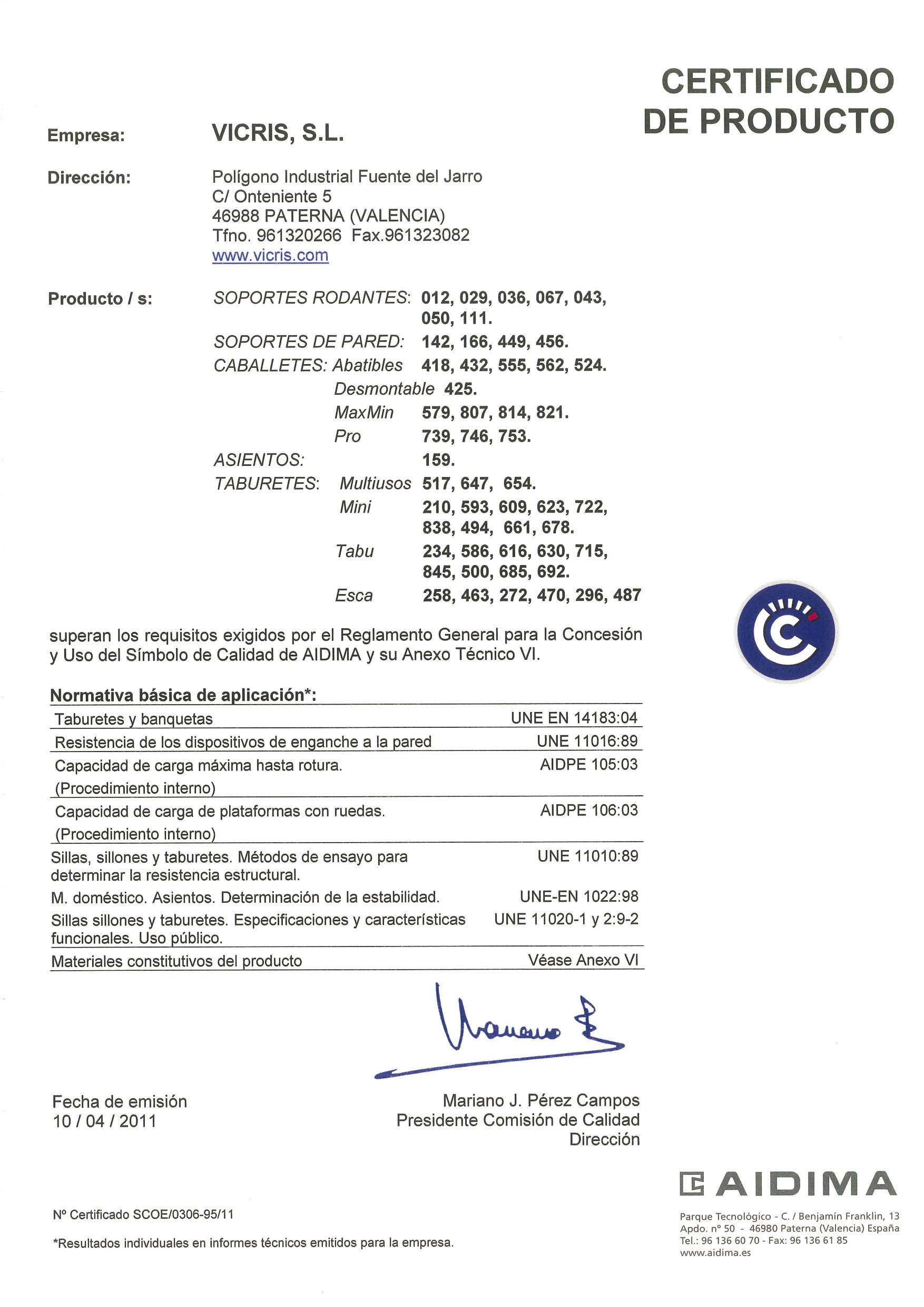 VICRIS tiene sus procesos de producción con el símbolo de Calida Controlada y todos sus productos se ensayan bajo Normas Europeas y si no existen se aplican protocolos de ensayo bajo normas similares en AIDMA.
